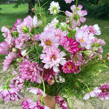A beautiful bounty of cut flowers grown by us right here on the farm. From Cosmos to Zinnias, Dahlias to Sunflowers, find our blooms from July through October roadside, at farmer's markets and by special order.